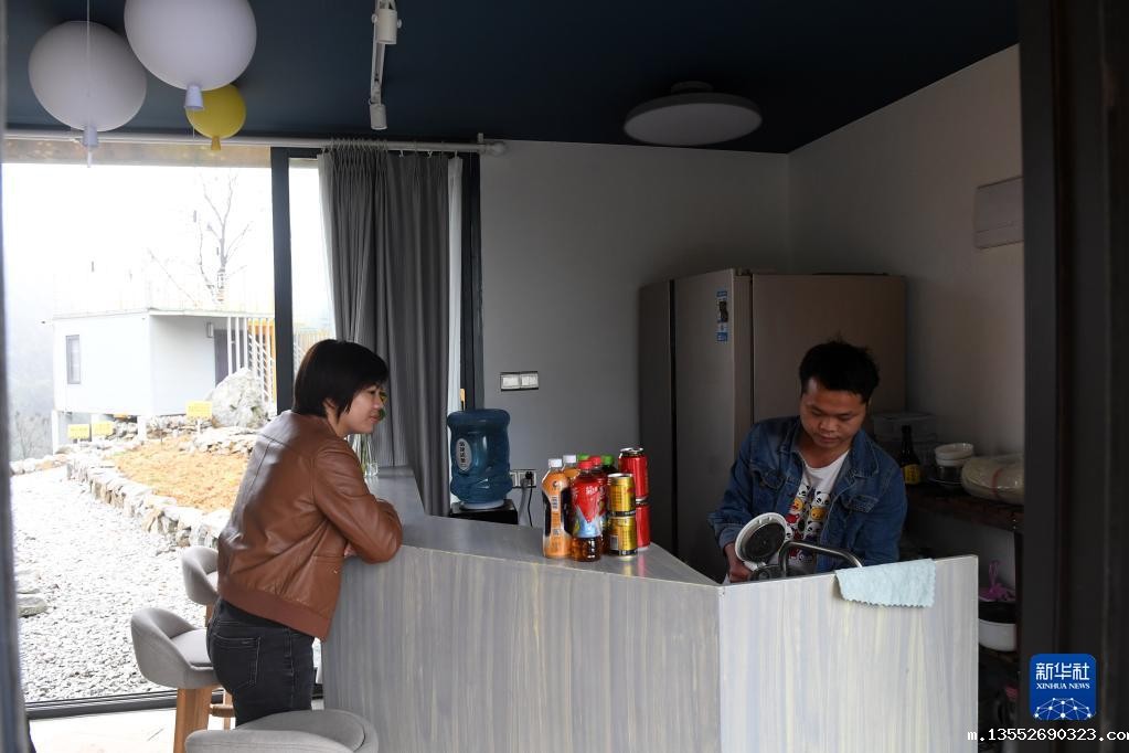 广西都安瑶族自治县隆福乡大崇村龙布屯,民宿服务员(右)为客人接水。
