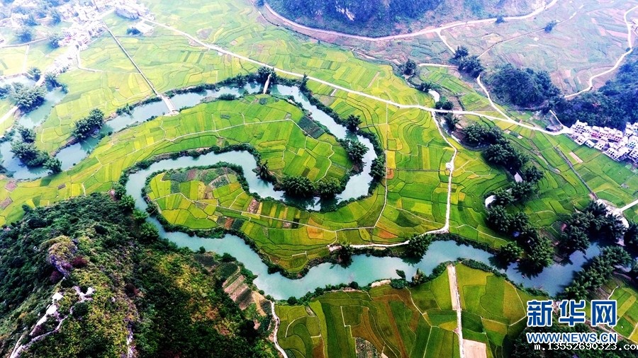 碧绿的河水在河池市东兰县武篆镇江平村的田野上形成一个巨大的“太极”图案。高东风摄