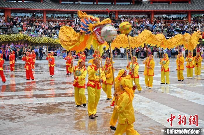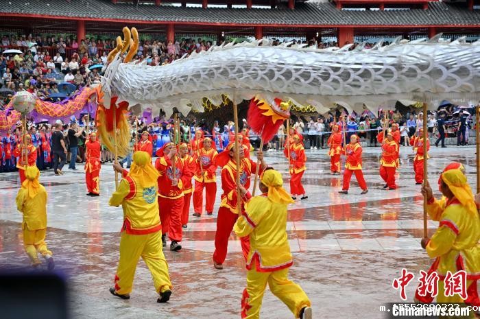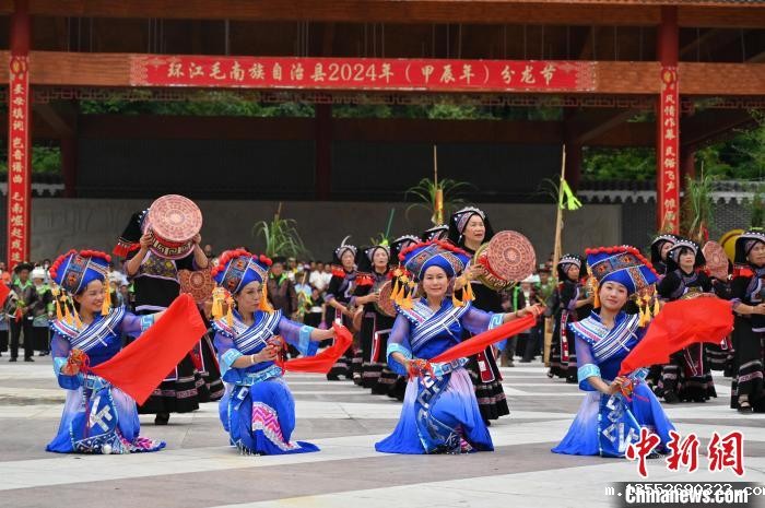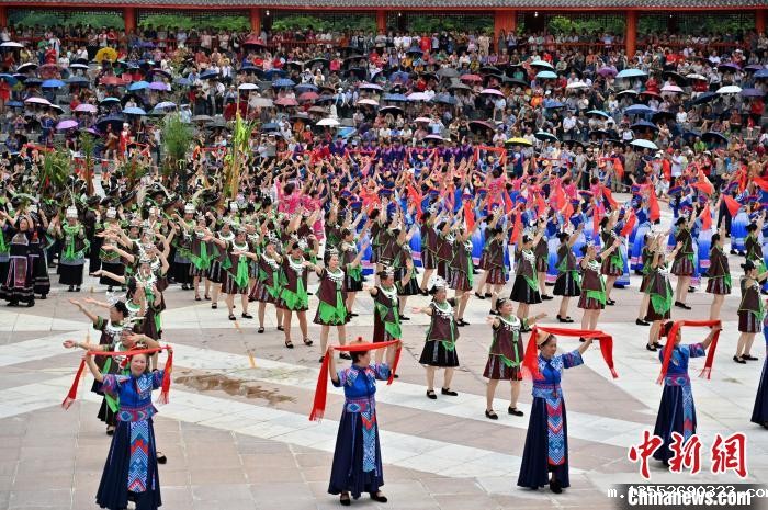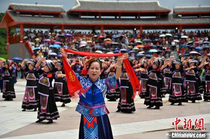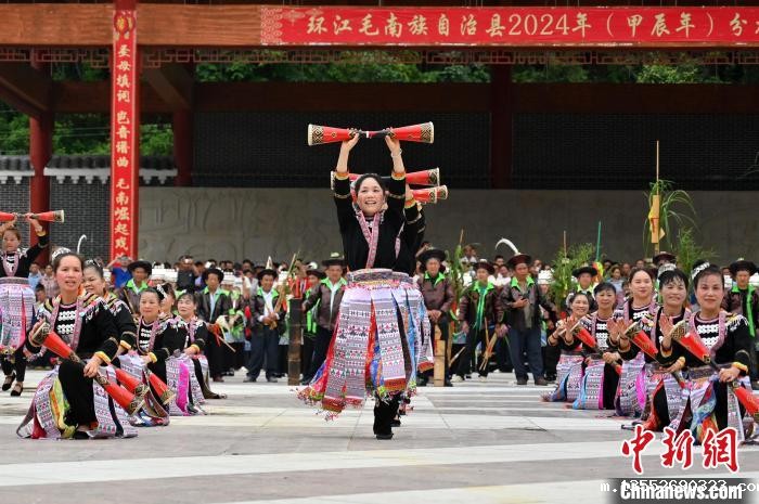 6月21日,中国唯一的毛南族自治县——广西河池市环江毛南族自治县举办传统民族节日“分龙节”。游人欢聚一堂,体验中国毛南族独具特色的民俗文化盛宴。图为民俗表演。中新社记者 俞靖 摄