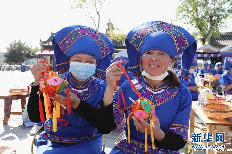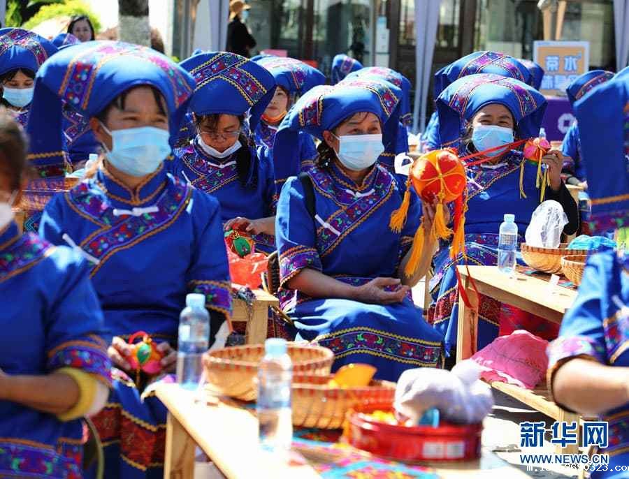 绣球传吉祥,壮锦织新天。日前,在广西靖西市锦绣古镇广场上,123名绣娘身着壮族传统服饰,整齐排座,熟练地穿针引线,缝制绣球。