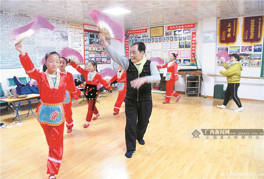 今年69岁的周锡生和67岁的爱人何秋萍都是靖西村人,从小喜欢彩调。2010年,周锡生以广西彩调剧团职业编剧的身份回乡开展彩调现状普查,发现活跃在舞台上的彩调演员都是老年人,找不到一个年轻人的身影。当年,他和爱人决定在家乡创办老还童彩调剧团,出资近14万元采购服装道具和音响设备,开设少儿彩调培训班,每逢寒暑假和周末免费教小学生学习彩调。如今,该剧团已累计招收70多名4—12岁的少儿彩调演员,曾多次受邀到广西、上海等地表演。2019年,老还童彩调剧团被评为柳城县新时代文明实践中心未成年人彩调非遗文化传承基地。