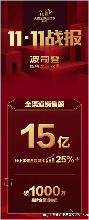 据官方数据显示,双十一活动期间,波司登天猫旗舰店10月21日第一波预售首小时就登上了本土服饰类男装、女装排行榜的首位,全渠道销售额突破9亿元。此后,在后续的周期内依然稳居本土服饰类品牌销售冠军宝座,在服饰品牌类销售榜单中位居行业第二。截至11月11日23时59分,波司登品牌全渠道销售额突破15亿元,品牌全渠道会员破1000万。