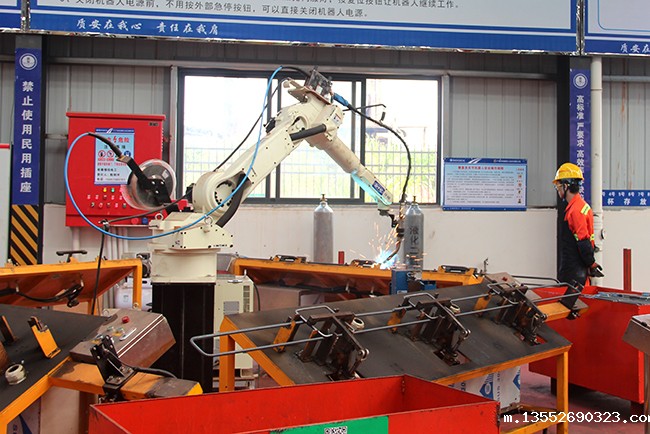 亮点工程之一全自动焊接机器人,可设置各种程序对不同钢筋焊接质量要求控制精准,免去人工焊接的繁杂工序,有效提高焊接加工质量。每天综合加工钢筋数量15T,人工每天焊接综合数量为10t,提高50%的焊接效率,且焊接质量大大增加。桥面铺装预埋门字筋、盖梁骨架及相关钢筋的连接均可采用全自动CO?保护焊机器人进行焊接,确保钢筋焊接质量,可以在空间中各个面之间相互转换加工,能适应各种复杂的工况,四个操作平台同时使用,大大提高了焊接机械人的使用效率。