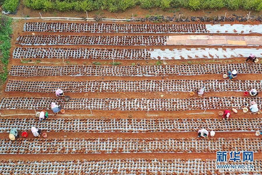 无人机航拍农户们在中华茉莉园培育茉莉花苗。新华网 刘君摄