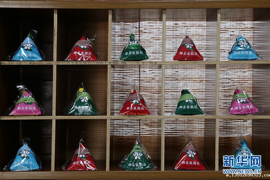 横县还依托“中国茉莉之乡“打造“茉莉闻香之旅“旅游品牌。在中华茉莉园游客服务中心,摆放着各式各样的香包、抱枕、挎包等产品,这些精美的文创产品因极具特色的茉莉花文化元素受到游客的青睐。