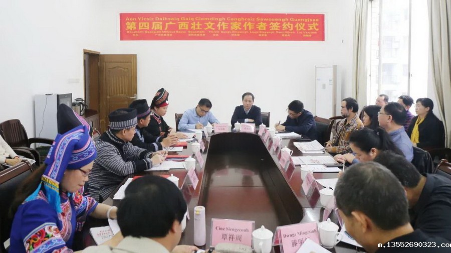 3月26日,第四届广西壮文作家作者签约仪式在南宁举行,主办单位广西民族报社与5位壮文作家作者签订了为期一年的合作协议。自治区民宗委副主任翚永红出席签约仪式并讲话。中国民族语文翻译局壮语文室、自治区民宗委民族语言文字处、 广西民族语文研究中心、 广西少数民族古籍保护研究中心、广西民族理论政策研究室、 广西民族出版社、三月三杂志社、广西民族高中等从事民族语文工作的兄弟单位主要负责人及专家学者、广西民族报记者编辑30多人参加了签约仪式,并就壮文作家作者培育及新时代壮文事业发展进行研讨。