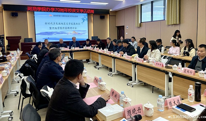 在中国作协第十次代表大会召开前夕,河池学院办学70周年庆典之际,12月4日,新时代多民族地区文学发展路径暨河池学院作家群研讨会在河池学院举行。本次研讨会作为河池学院70周年校庆文学周重要活动之一,由河池学院文学与传媒学院主办。班源泽、凡一平、田湘、区晓菲、费城、杨合、又见、卢俞州、覃展、宋先周、寒云、牛依河、桐雨、寒云、韦云海等河池学院知名校友作家及媒体记者等40多人参加了研讨会。河池学院副校长贺卫国致辞,文传学院院长欧阳珍、副院长陈代云、创意写作中心主任黄土路分别主持。