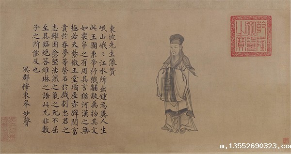 明代一位工书画的大臣朱之蕃也画过苏轼像,作品称作《临李公麟画苏轼像》,这件作品所依据的粉本传为苏轼友人李公麟所作,所以本件作品称“临“为临摹之意。