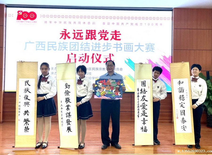 本报讯(记者 黄浩云)4月12日,“永远跟党走——广西民族团结进步书画大赛“启动仪式在南宁市天桃实验学校翠竹校区举行。此次大赛由广西壮族自治区民族宗教事务委员会主办,广西民族出版社承办。活动主题为“铸牢中华民族共同体意识,喜迎中国共产党成立100周年“。自治区民宗委党组成员、副主任翚永红,自治区民宗委二级巡视员覃汉华出席启动仪式。
