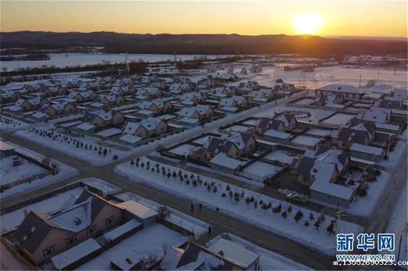 1月17日,夕阳下的黑龙江塔河县十八站鄂伦春民族乡鄂族村(无人机照片)。新华社 张涛 摄